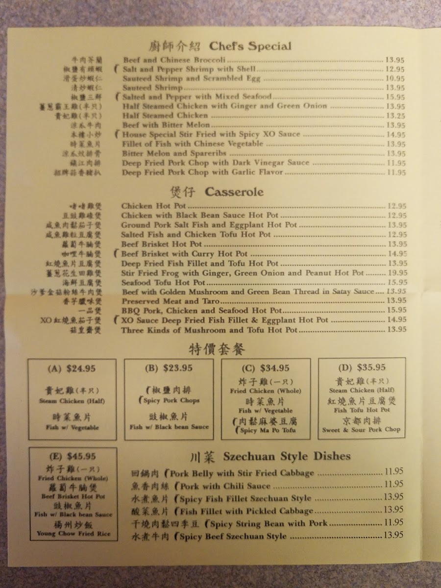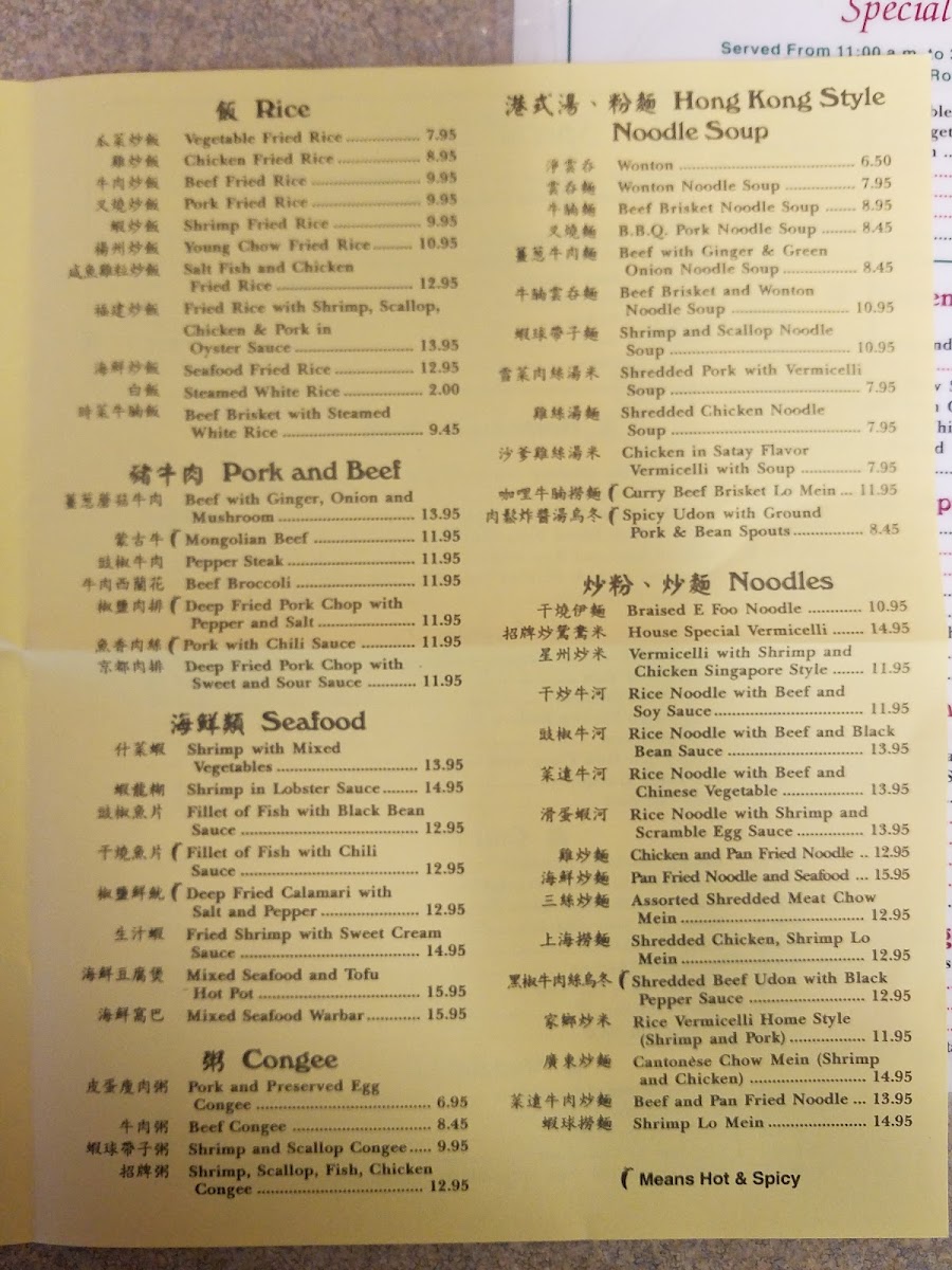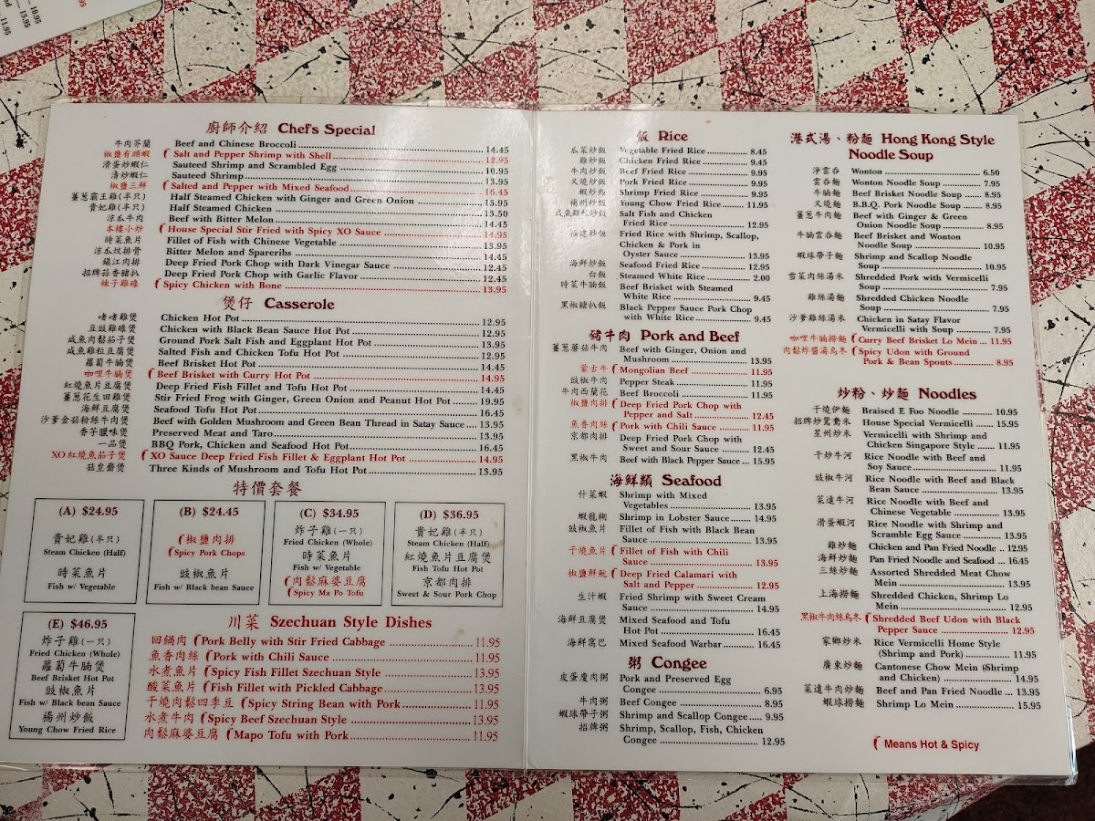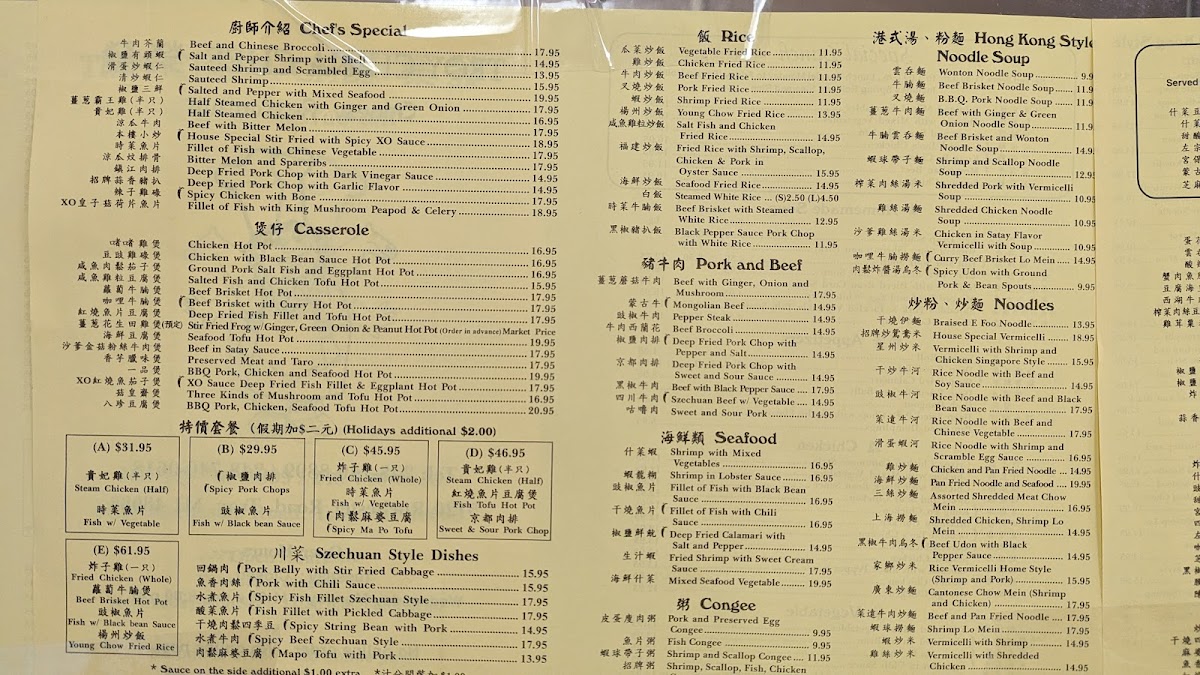 You’ll find familiar favorites like Yang Chow Fried Rice and Kung Pao Chicken alongside warming options such as Shrimp Congee and Hot and Sour Soup. Noodle dishes like Beef Chow Fun and Singapore Mie Fun bring a flavorful, textured experience, perfect for lingering over a relaxed meal. The menu also features a variety of steamed and braised dishes, including Steamed Chicken and Pork Belly Stew, which fit nicely with the no-frills, straightforward atmosphere of the restaurant.
